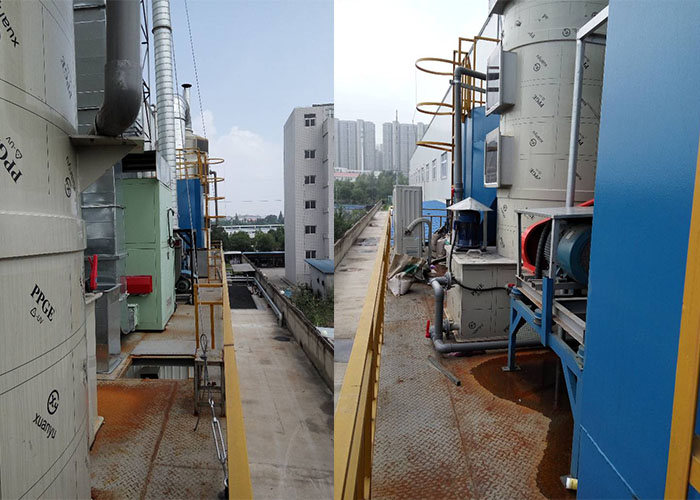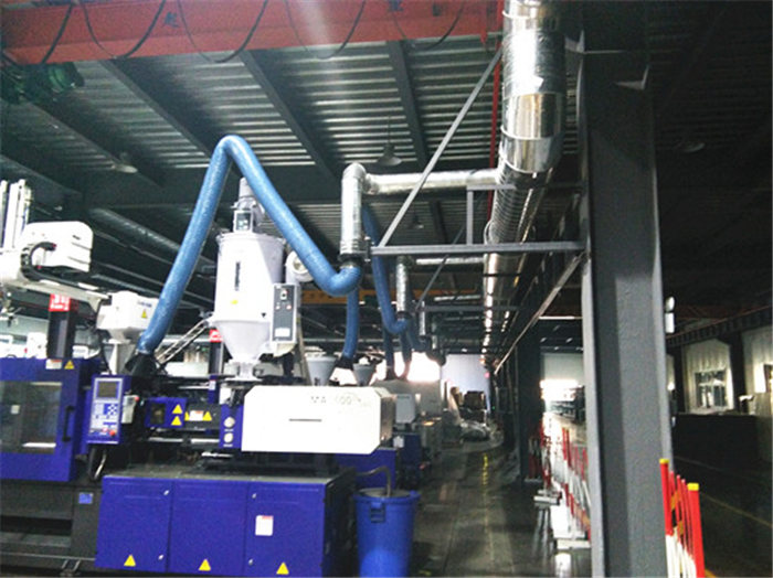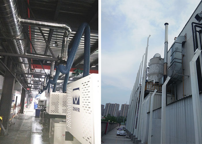 技術特點:廢氣排放點多達55處,且為了滿足生產需求廢氣收集系統需要采用移動式且360度旋轉,本項目采用機械臂收集即達到了收集效果又滿足了生產需求。