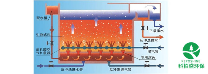 曝氣生物濾池(簡稱BAF),其通過物理吸附截流作用和生物降解作用來實現水體中SS、氮、磷和有機物等污染物的去除。污水流經濾料層,水體中的污染物被濾料層吸附、截流并被濾料上附著生長的微生物降解轉化,從而實現水體的凈化。
