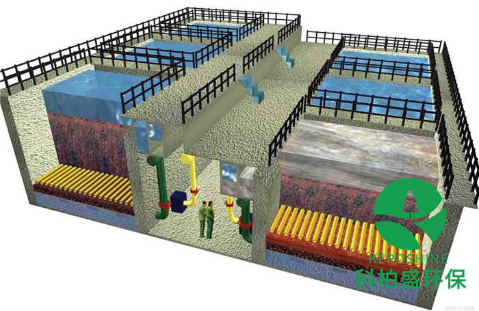 曝氣生物濾池由配水系統、濾磚、承托層、濾料層以及出水槽等結構組成,通過濾池的吸附截留和生物降解作用有效降低了氮磷、有機物及SS等指標,出水水質滿足達標排放。