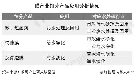 水處理作為膜產業下游的一個重要應用領域,也是膜材料的主要去向:微濾膜主要應用于污水、廢水處理等領域;超濾膜在污水、廢水處理及回用和給水凈水領域應用廣泛;納濾膜主要應用于純凈水、軟化水、無離子水、海水淡化等方面;而反滲透膜可應用在海水淡化等領域。