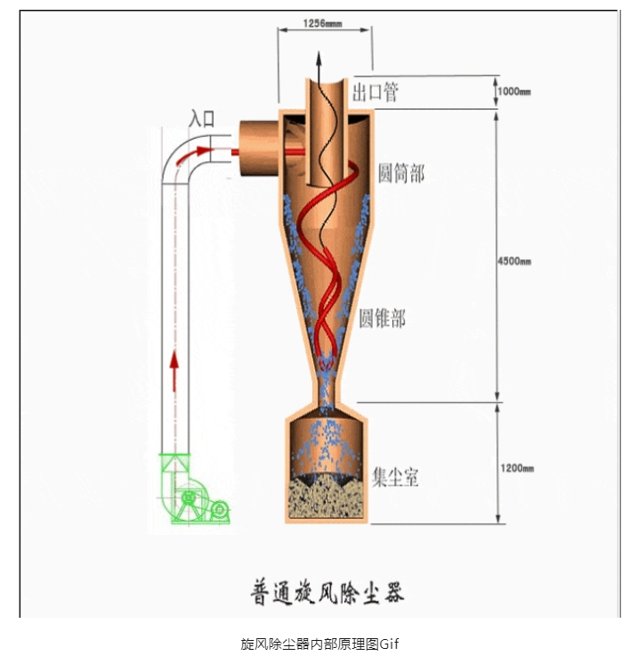 含塵氣體通過進料口進人旋風除塵器后,沿筒壁自上而下作螺旋形旋轉運動,粉塵顆粒在慣性離心力的作用下甩向外壁,在氣流和重力共同作用下沿壁面向下落入集塵室中,當這股向下旋轉的氣流到達錐體底部附近時,大部分粉塵已從氣流中除去,潔凈的氣流開始轉變方向沿軸心向上旋轉運動通過出口管或排氣芯管排出。