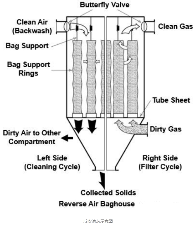 逆氣流清灰,顧名思義是利用反向氣流來清除附著在過濾袋上的灰塵和顆粒物,主要有反吹和反吸兩種方式,前者以正壓將氣流吹入濾袋,后者則是以負壓將氣流吸出濾袋。和機械清灰一樣,為了保證清灰效果,逆氣流清灰也多采用分室工作制度,然后通過閥門自動調節對每個分室里面的氣流進行反回流動。