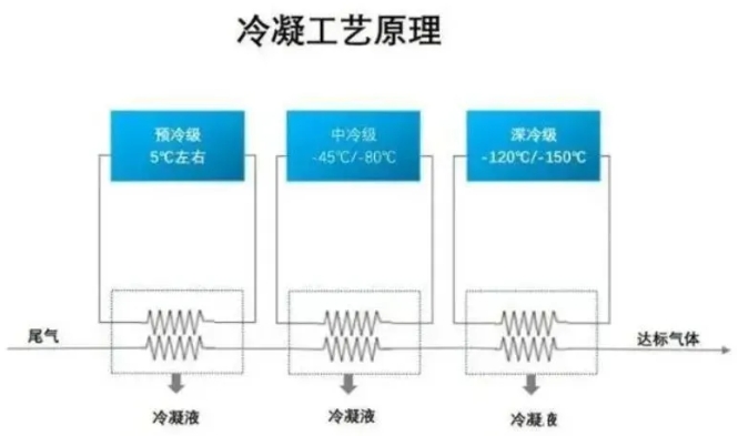 冷凝法在理論上可達到很高的凈化程度,但是當其濃度低于較低時,需采取深度冷凍,這將使運行成本大大提高。通常在VOCs的處理中,冷凝可作為焚化、洗滌、吸附等的前置處理步驟。