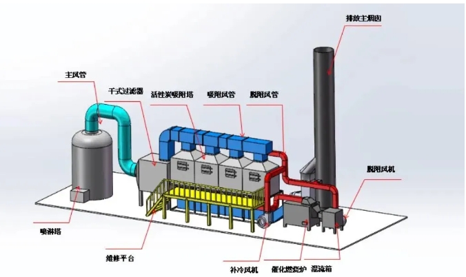 吸附法可以將廢氣中的有機成分與吸附劑進行物理結合或化學反應,達到去污的目的。適宜于中低濃度且回收利用價值高的有機廢氣VOCs的處理,可應用于凈化涂料、油漆、塑料、橡膠等化工生產排放出的含溶劑或有機物的廢氣。