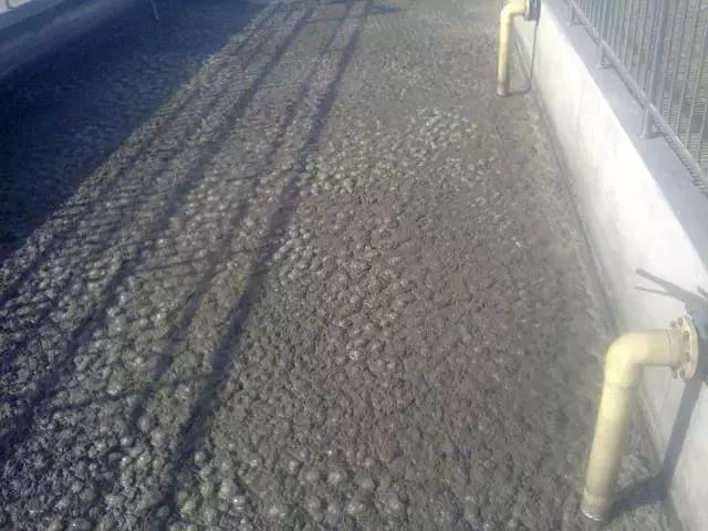 產生原因:進水負荷過高,沖擊負荷較大,造成部分污泥分解并附著于氣泡上使氣泡發粘不易碎,因此水面積存大量氣泡。